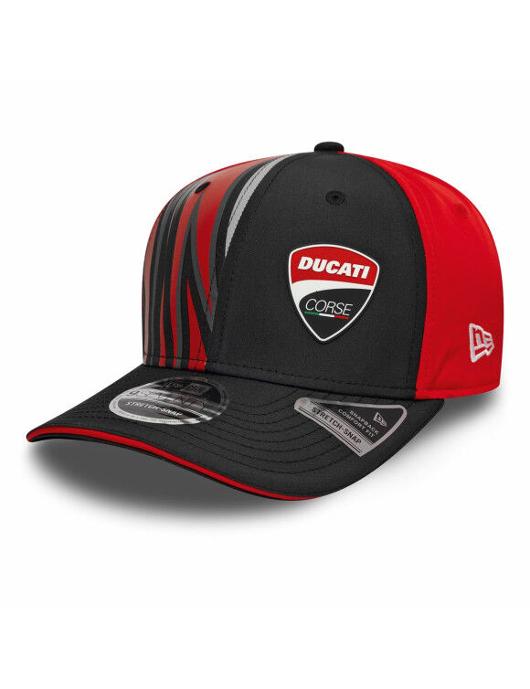 It features the iconic Ducati Corse shield in the foreground. Made with lightweight materials, it is the perfect accessory for those seeking a bold and modern look without sacrificing comfort.